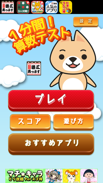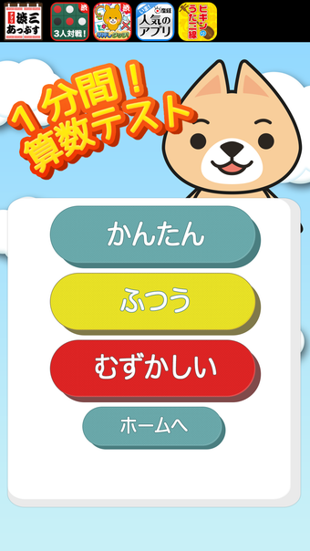 1分間!算数テスト~数字を使った脳トレゲーム~渋三あっぷす~は、かわいいイヌのキャラクターが出題する足し算を解いていく計算ゲームです。画面に並んだパネルの中から答えとなる数字をすばやく選んで、1分以内に解答すればゲームクリアです。