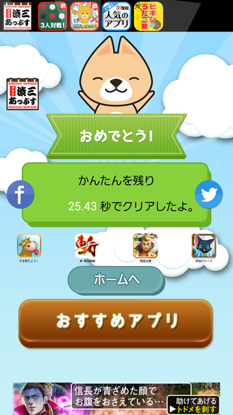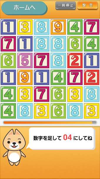 トップ画面には柴犬風のかわいいキャラクターが登場し、ゲームの難易度を「かんたん」「ふつう」「むずかしい」から選択します。画面には難易度に応じて、何枚か数字の書かれたパネルが表示されます。イヌのキャラクターが数字を出題するので、その数字になるようにタップでパネルを足していきます。制限時間の1分以内に全てのパネルを消したらゲームクリアです。
